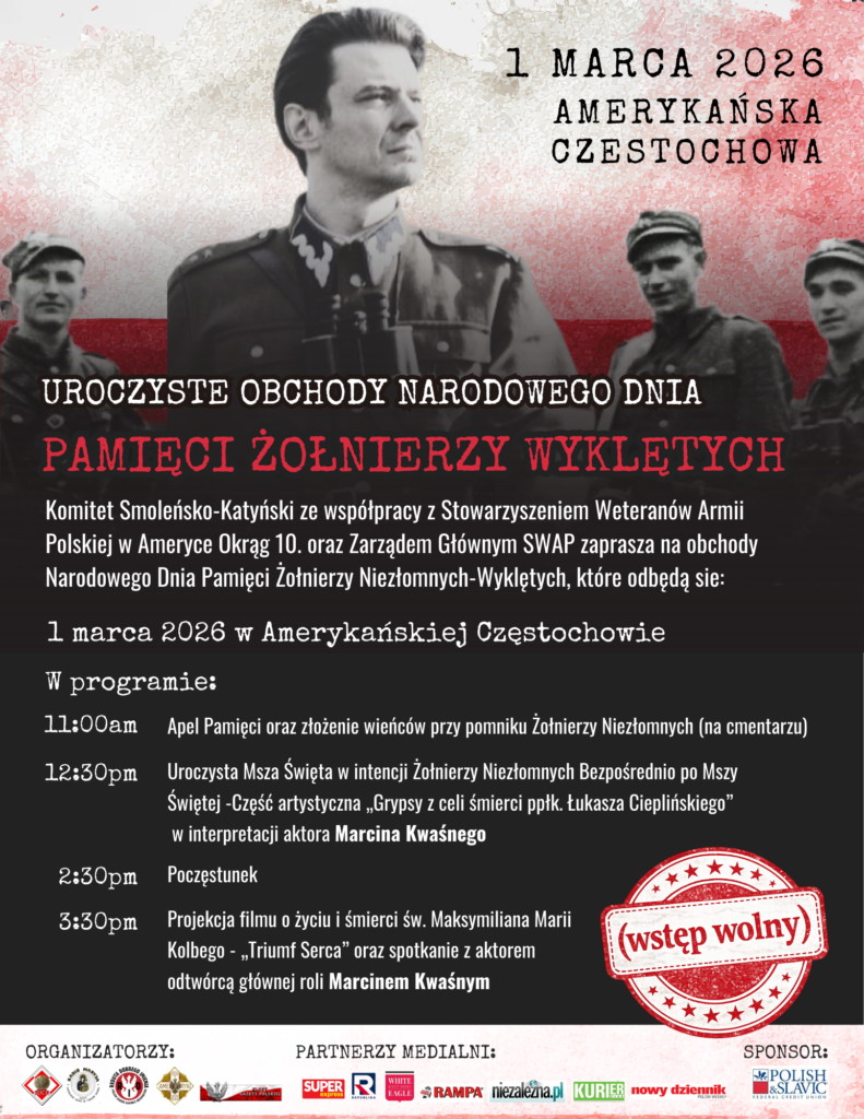 Komitet Smoleńsko-Katyński we współpracy ze Stowarzyszeniem Weteranów Armii Polskiej w Ameryce Okręg 10 oraz Zarządem Głównym SWAP zaprasza na obchody Narodowego Dnia Pamięci Żołnierzy Niezłomnych-Wyklętych, które odbędą się: